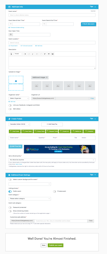 ⚠️ Important: Hitting “Save” keeps your event private. Be sure to press “Publish” when you’re ready to launch!